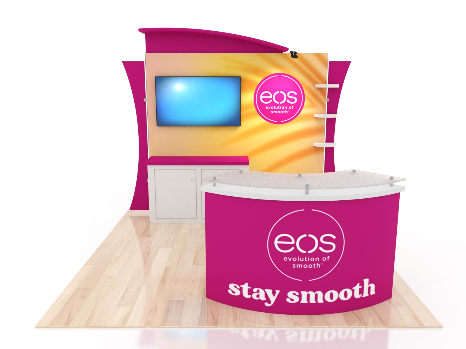 These designs come with ample storage in cabinets on the backwall and in the curved reception counter. Add vinyl graphics to both for more branding. The entire display packs in a fabric-lined, fully jigged custom crate. Each component is numbered for effortless assembly.